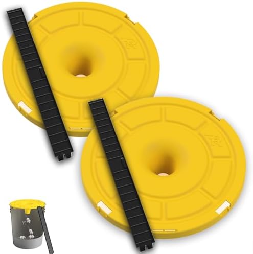 Transform any standard 5-gallon bucket into an efficient, multi-catch mouse trap with the RinneTraps Hole in One Bucket Lid. This innovative trap features a simple yet effective design with no moving parts or chemicals needed. The durable yellow and black lid securely fits on your bucket, while the included ramp provides easy access for mice. Simply add bait under the lid, and let the trap do the work - mice climb up, investigate the bait, and fall through the center hole into the bucket below. With its maintenance-free operation and ability to catch 40+ mice without resetting, this trap is perfect for barns, farms, sheds, and other locations requiring reliable pest control. The mechanical design eliminates springs that can break or wear out, ensuring long-lasting performance in rugged environments. Made in the US, this lightweight yet sturdy trap measures 12" x 12" x 3". Note: Bucket not included with purchase.