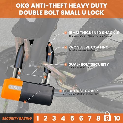- UPGRADED MAXIMUM-GRADE ANTI-THEFT: Featuring 11/16" (18mm) 3T Hardened Manganese Alloy Steel U-Shackle and Thickened Seamless Tube Alloy Steel Lock Body, this upgraded OKG Small U-Lock withstands 90 kN cutting force and 75 kN tensile strength (tested to ART 4-Class standards), offering 300% higher impact resistance than standard U-locks. The DUAL-DEADBOLT mechanism blocks pry tools, bolt cutters, and portable grinder attacks, making it ideal for high-crime urban areas.