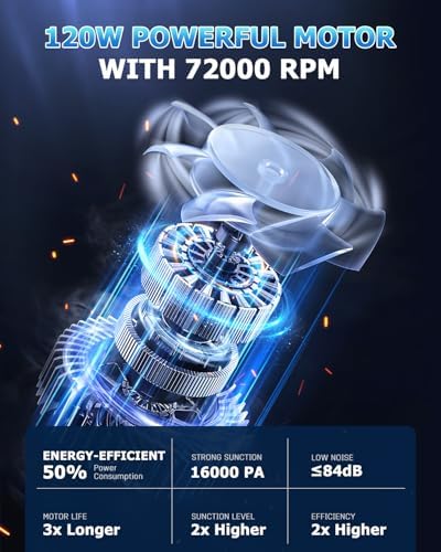 - 🌀【16KPA POWERFUL SUCTION】The dust busters cordless rechargeable is equipped with a 120W high-powered motor that spins at up to 72,000RPM and provides 16,000PA powerful suction. Whether it's dust and debris on the floor or hidden dirt in narrow crevices can be quickly cleaned. Easily cope with the cleaning of home, car interior, office desktop, efficiently clean every corner, saving you precious time and energy