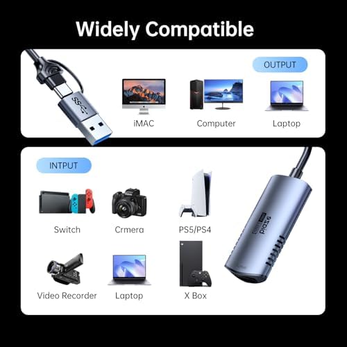 - 【USB-A+USB-C Dual Interfac】With USB-A & USB-C dual interface design, this capture card for streaming can be compatible with most current laptops, tablets, mobile phones, cameras, webcams, Kindle, and other devices. It can be used for camera live broadcasts, mobile game live streaming, console game live streaming, and computer live streaming.