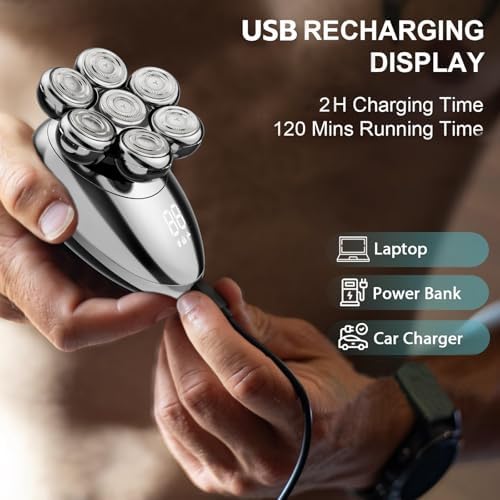 Head Shaver for Bald Men, 7D Electric Rechargeable Wet/Dry Shaving Razor with LED Display, 5-in-1 Grooming Kit Waterproof Bald Head Trimmer, Ideal Gift for Men (Silver)