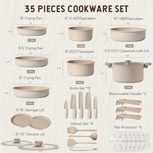 CAROTE 35pcs Pots and Pans Set Non Stick, Cookware Set, Removable Handle Pots and Pans Nonstick, RV Oven Safe Cookware, Induction Kitchen Cookware Set, Knife Set, Taupe