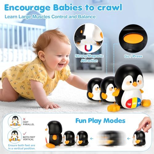 - Crawl, Learn, and Grow Together: The 2 tiny penguins waddle in a line behind the large one, tempting babies to crawl and explore—building gross motor skills naturally. Gently press the penguins’ round bellies, and watch lights and music respond to their touch, sharpening hand-eye coordination. With the infant toys 0-6 months, babies learn while playing, blending physical development with early education seamlessly. Perfect crawling toys for babies 6-12 months.