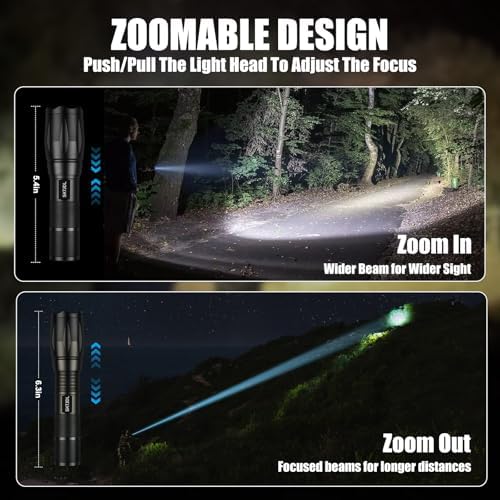 - 5 MODES AND ZOOMABLE ADJUSTMENT: The affordable A2 handheld flashlight offers 5 modes: high brightness/medium brightness/low brightness/flash/SOS, and is equipped with adjustable near/far beam functions to meet the needs of close-range searching or long-distance lighting. The tail switch mode is simple and intuitive, requiring only the press of a button to turn on or off