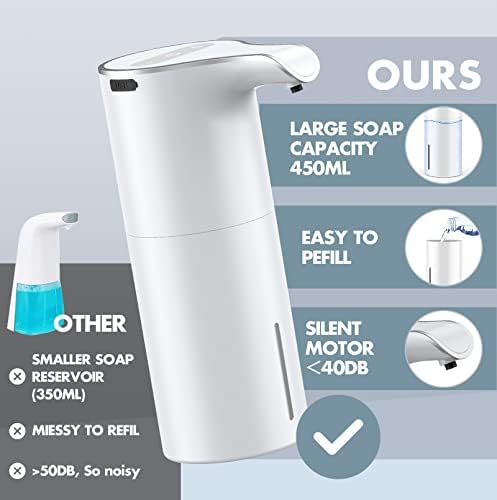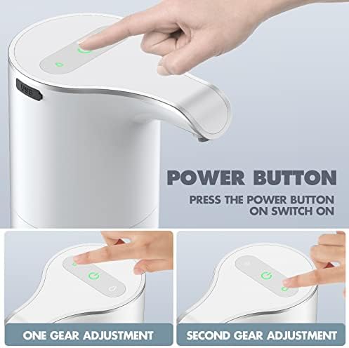 - AUTOMATIC & TOUCHLESS: This automatic soap dispenser touchless design is equipped with an infrared motion sensor, dispenses soap in 0.25 seconds, has 5 adjustable foam levels, our dispenser can be switched with the small and large drop button. Whether for adults or children, you can easily switch modes to achieve the desired foam strength.