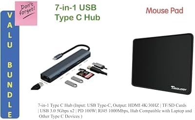 • TigologyAccessories Including Mouse Pad and 7-in-1 USB Type C Hub (Input: USB Type-C, Output: HDMI 4K/30HZ | TF/SD Cards| USB 3.0 5Gbps x2 | PD 100W| RJ45 1000Mbps )