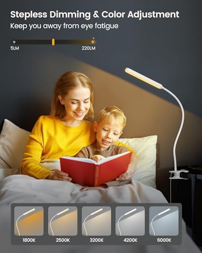 • [Eye Caring and Even Lighting] This clip on reading light features 38 high-performance LED beads that deliver even & bright illumination without flicker or glare. Its eye caring amber mode(1800K) actively reduces eye strain and discomfort, making it the perfect bed headboard clip on light. An ideal gift for bedtime readers and night workers.
