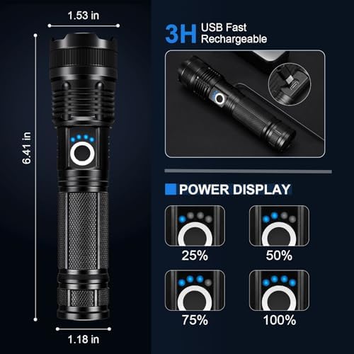 - 【5000ɱAh ΒATTERY & Power Display】LED flashlight has a built-in 5000ɱAh rechargeable ΒATTERY that can provide you with up to 15 hours of outdoor lighting time and can be recharged more than 1500+ times. 4 blue LED indicators show the charging status (25%, 50%, 75%, 100%)
