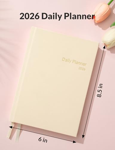 SUNEE 2026 Daily Planner A5 Hardcover – Hourly Schedule Organizer with Monthly Tabs & Task Tracker – Beige Cover Time Management Notebook for Work, School, Personal Goals