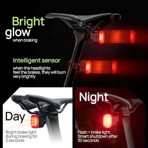 - 3️⃣ [Smart Tail Light with Brake Sensor]: Enhance your cycling safety with our lights for bicycle equipped with a smart tail light. The brake sensor activates automatically, offering a reliable bicycle safety light that alerts others of your movements for increased security day or night.
