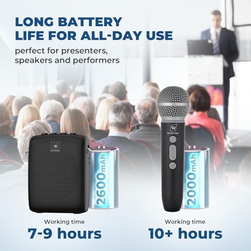 - Rechargable Battery for Portable PA System: The battery-powered amplifier (2600mAh, 7-9 hours) and long-range wireless mic (2000mAh, 10+ hours) create a portable outdoor sound system ideal for: Teachers in classroom amplification systems. Fitness coaches during group workouts. Presenters at meetings or events, and performers who need uninterrupted power.