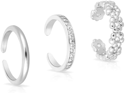 3pcs Silver Toe Rings, Open Adjustable Copper Toe Ring Set Flower Diamond Plain Foot Ring Summer Beach Foot Jewelry for Women