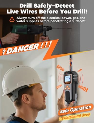 - 6-in-1 Pro Wall Detector Scanner with Depth:No more blind drilling!The DSF01 Stud Finders & Scanners reliably detects Metal Studs/Pipes(Up to 4.7″ deep)/Copper Pipes(Up to 3.9″deep)/Live Wire(Up to 2″deep)/PLUS identify Magnetic vs. Non-Magnetic materials. At the same time,it is also an excellent Wood Finder Wall Scanner (With Exact & Deep modes).