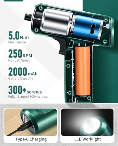 - 【5Nm Torque & 3.7V 2000mAh Battery】The WORKBLESS power screwdriver delivers 5Nm max torque and 250 RPM speed for efficient drilling and fastening in wood, plastic, and light metal. The 2000mAh battery ensures long running time (300+ screws per charge) and supports Type-C fast charging (2-3 hours).