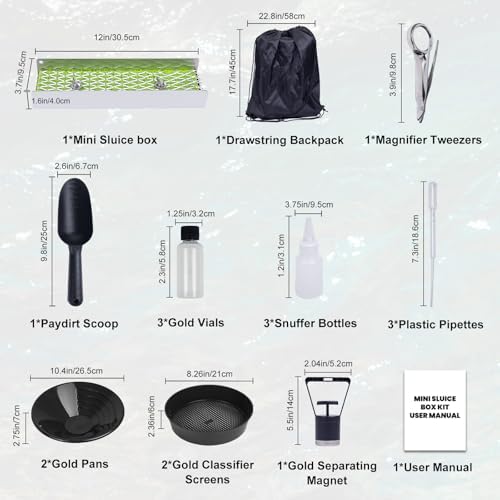 - 【18pcs Gold Prospecting Kit with Mini Sluice Box】Complete sluice box gold mining equipment includes 12" Mini sluice, 2 gold pan, 2 classifier screen, magnifier tweezers, separating magnet, 3 snuffer bottles, 3 storage vials, 3 pipettes, paydirt scoop and drawstring backpack. Everything needed for professional gold recovery in rivers/streams.
