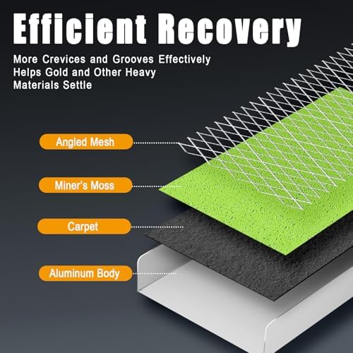 - 【High-Efficiency Recovery System】Dual-layer miner's moss with deep ribbed matting captures 98.7% of gold particles down to 50 mesh. Angled riffle design combined with expanded metal grid creates optimal flow rate for separating heavy materials from sand/clay.