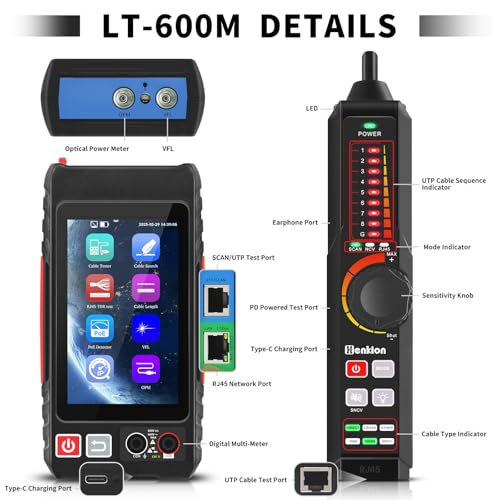 Multifunction RJ45 Network Caber Tester, UTP Cable Tester Ethernet Cable Tracer, 4" IPS Touch Screen Support Network Tools, Digital Multi-Meter, VFL,OPM, POE++ Detect,RJ45 TDR, Cable Length,NCV