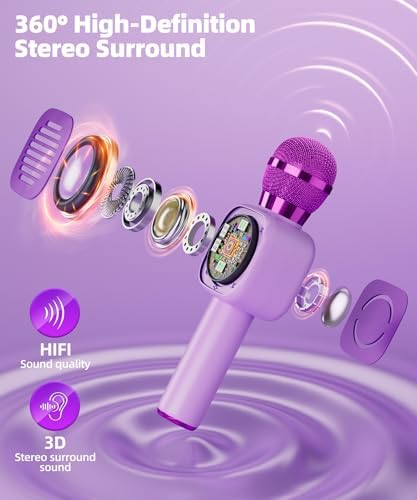 Bluetooth Karaoke Microphone Toy for Kids - Mini Portable Speaker with LED Lights, Wireless Pairing (TWS) for Duet Singing, Christmas Birthday Gift Toys for Boys & Girls Ages 2-12 (purple - 1)