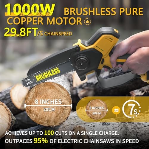 - 【Powerful 1000W Brushless Motor】 Equipped with a high-efficiency brushless motor and a chain speed of 29.8 feet per second, this mini chain saw cuts through 8-inch-thick wood in just 7 seconds.
