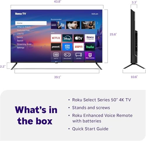 Roku 50-Inch Select Series 4K UHD Smart TV - HDR, Dolby Audio, Compatible with Alexa, Voice Remote, Bluetooth Mode, w/AUX HDMI Cable, CPS 1-Year Protection Plan + Streaming kit