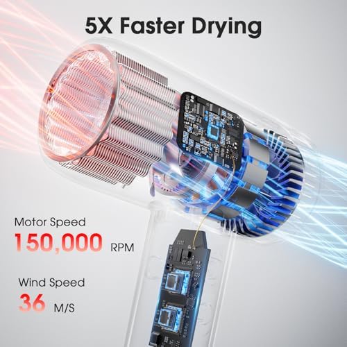 - 【Quick Drying & Negative Ion Hair Care】This High-speed hair dryer releases up to 200 million negative ions during the drying process, reducing frizz, and leaving hair smooth and shiny. Equipped with a 150,000 RPM motor and a wind speed of up to 36 m/s .Additionally, it features NTC intelligent temperature control technology, monitoring temperature at a frequency of 110/s, making real-time adjustments to precisely prevent heat damage and provide comprehensive protection for hair health