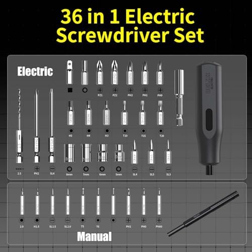 36 in 1 Electric Screwdriver Kit with Manual Screwdriver, 4V Rechargeable Screwdriver Set with Socket, Extension Rod, 2N.m Torque and LED Light, Suitable for Furniture and DIY