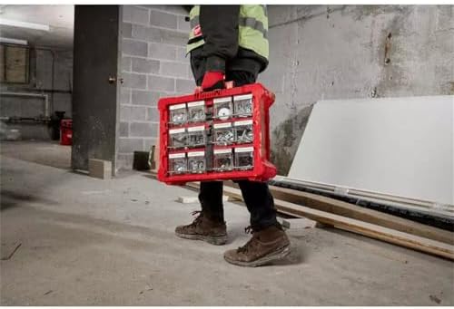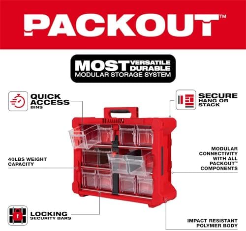 The PACKOUT Modular Storage System is the industry's most durable and versatile storage system. The PACKOUT Tilt Bin Organizer features ten removeable quick-access bins that store a variety of small tools, parts, and materials. The impact-resistant base allows this organizer to securely stack or hang with other PACKOUT system components. The stainless locking security bars keep the bins firmly shut during transport. The Milwaukee PACKOUT Modular Storage System allows you to customize and build your storage system to easily transport and organize your tools and accessories.