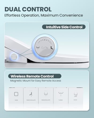 - 【Dual Control - Remote & Side Knob】: Designed for convenience, the bidet toilet seat features a side knob with indicator lights for wash and drying modes, plus a wireless remote perfect for seniors and expecting mothers. The stylish remote can be wall-mounted or handheld, combining comfort with modern elegance