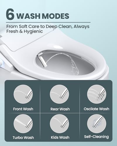 - 【6 Customized Wash Modes】: The electric bidet toilet seat offers 6 options - FRONT, REAR, OSCILLATE, TURBO, AUTO & CHILD WASH—with 5 adjustable water pressures, every family member gets a perfectly personalized, spa-like clean. Gentle for kids, refreshing for adults, comfort and hygiene for all in one touch