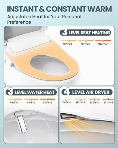 - 【Instant Heating & Year-Round Warmth】: Enjoy a heated toilet seat and upgraded TANKLESS HEATING technology that delivers endless warm water instantly - no waiting, no cold shock. Customize your comfort with 3 seat temperatures, 3 water temperatures, and 4-level warm air drying for a cozy spa-like experience every season