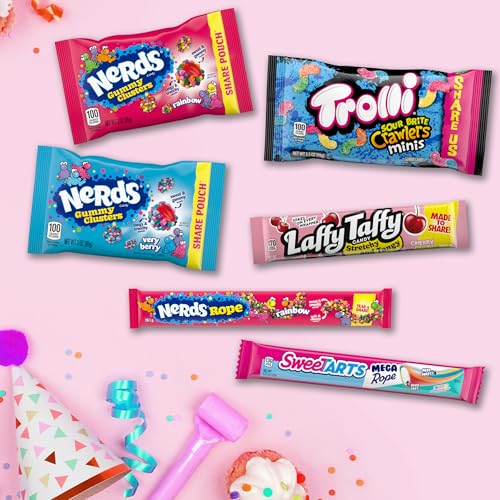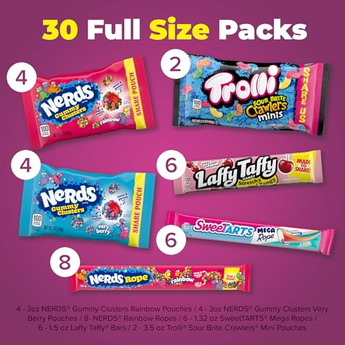 - 30 FULL SIZE PACKS: four (4) NERDS Gummy Clusters Rainbow Pouches, four (4) NERDS Gummy Clusters Very Berry Pouches, eight (8) NERDS Rainbow Ropes, six (6) SweeTARTS Mega Ropes, six (6) Laffy Taffy Bars, two (2) Trolli Sour Brite Crawlers Minis Pouches