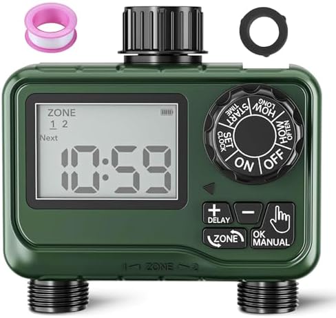 - 【Dual-Zone Independent Programming Control】This sprinkler timer has two independent outlets, each zone can be independently programmed, and watering time, frequency and duration can be customized. It can effectively meet different water needs, ensuring uniform watering and optimal moisturizing effect.