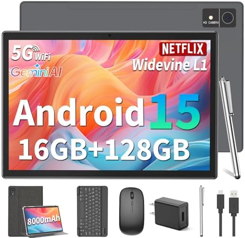 Android 15 Tablet with Keyboard - 10 inch Tablet, 16GB+128GB, 1TB Expand, Octa-Core, 2.4G/5G WiFi, 8000mAh, BT V5.0, GMS, Widevine L1, Split-Screen, with Case, Mouse, Stylus(Black Case)