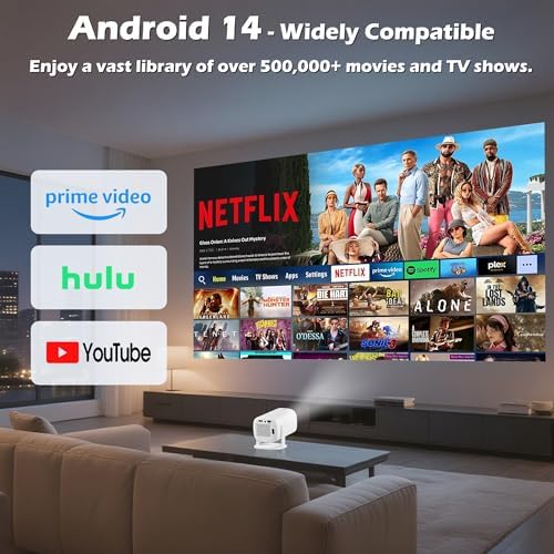 • Smart Projector with Android 14: The projector is equipped with the advanced Android 14 system, 1G+8G running memory, relying on the optimization and upgrade brought by the new system architecture to bring you a smoother user experience