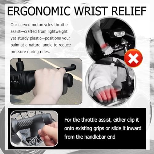 - Ergonomic Wrist Relief: Our curved motorcycles throttle assist—crafted from lightweight yet sturdy plastic—positions your palm at a natural angle to reduce pressure during rides. Simply clip its 0.96-inch inner diameter ring onto most grips for instant setup; no tools or complicated steps required
