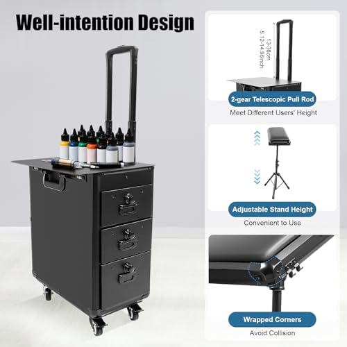 Tattoo Travel Case, Tattoo Workstation Makeup Suitcase with 3 Drawers & Wheels, 2 in 1 Rolling Makeup Case with Tattoo Armrest Stand Tripod for Makeup Enthusiasts & Tattoo Artist (Metal Plate)