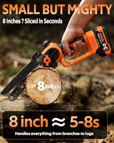 - 2025 UPGRADED SAFE PRO BATTERY: Armed with a 3.0Ah high-capacity battery (40% larger than most mini chainsaws use), enjoy up to 150 cuts on 6-inch Log and 300 cuts on 4-inch branches—on a single charge. Now you can trim the whole backyard, camping firewood with zero interruptions