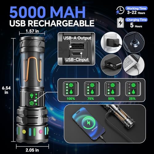 - 【5000mAh Battery & Powerful Endurance】Led handheld flashlight is equipped with 5000mAh mAh rechargeable battery, which can work continuously for 8-24 hours , it can be used for camping, fishing, walking the dog, power outages, emergencies, or other outdoor activities, the flashlight's strong and stable performance ensures that it can be used reliably when you need it.