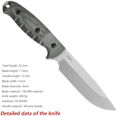 - Total length: 25.3cm Blade length; 11.4 cm Handle length: 12.5cm Blade width: 3.5cm Blade thickness: 4.0mm Blade material: 14c28n Knife weight: 204g Weight: 353g Hardness: 58-60HRC Dial: Black and stone washed Handle material: Mikta Others: Black gift box + carbon fiber texture K sheath. The entire knife is produced by CNC computer milling and CNC water grinding, durable and sharp.