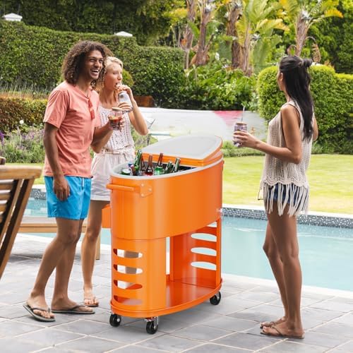 This 70-quart oval cooler cart combines functionality with durable construction. The insulated plastic body maintains temperatures for extended periods, keeping drinks cool for up to 48 hours. The reinforced steel frame with powder coated finish ensures long-lasting use. Four multi-directional wheels (two locking) provide smooth mobility across various surfaces. Thoughtful design elements include ergonomic handles, a built-in bottle opener with cap catcher, and an included ice scoop. The bottom storage tray offers additional space, and the integrated drain system with removable hose simplifies cleaning. Ideal for backyard gatherings, camping trips, or beach outings, it offers practical storage for up to 87 cans or 48 bottles with its spacious interior.