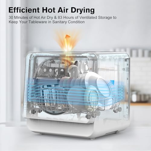 - 【3-IN-1 Dishwasher】 The portable dishwasher countertop functions as a dishwasher, dryer, and cabinet. It not only washes but also dries your dishes with an advanced drying system, keeping them dry and odorless. After each wash cycle, an additional Air Dry mode provides 30 minutes of hot air drying, with 83 hours of ventilated storage to maintain sanitation and provide clean dishes whenever you need them