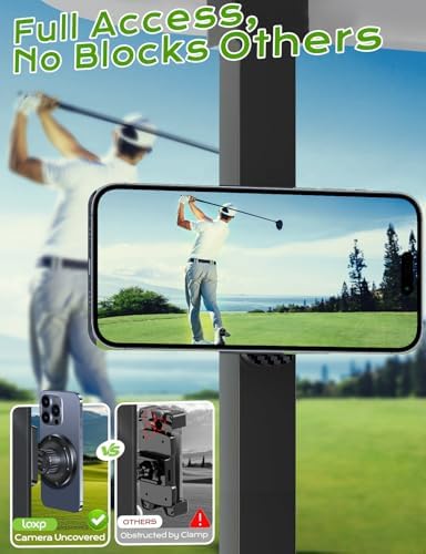 • [Will not block the screen and camera]: Rotate your phone to any angle, Keep at eye level - never blocks buttons or cameras in portrait or landscape mode. Whether you are watching videos, taking photos or checking golf apps, this phone holder for golf cart can easily adjust the vertical or horizontal direction of the phone. It allows you to record your swing movements at any time, correct your posture, and fully record your every wondful shot