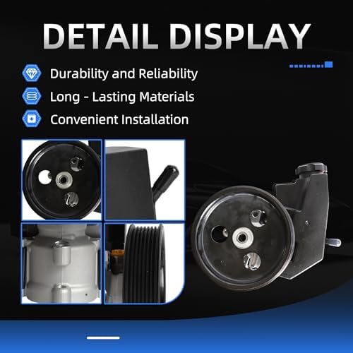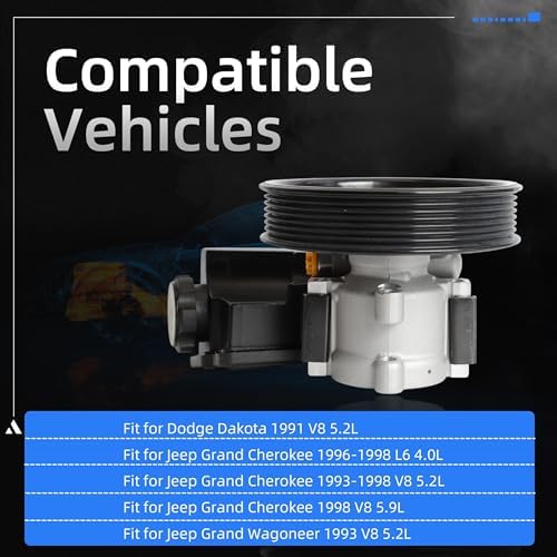 Compatible Vehicles:Fit for Dodge Dakota 1991 V8 5.2LFit for Grand Cherokee 1996-1998 L6 4.0LFit for Grand Cherokee 1993-1998 V8 5.2LFit for Grand Cherokee 1998 V8 5.9LFit for Grand Wagoneer 1993 V8 5.2LReplacement Part Number:20-39771, 20-39881, 2039771, 9639771, 2039881, 52088139, 53006286, 52037812, 52087658, N73319111, 73319111, 12725, 2725Complete Set Consists of:20-39771 Power Steering Pump x 1Power Steering Pump Power Assist PumpPulley Included: YesReservoir Included: YesEasy to install, Direct Replacement