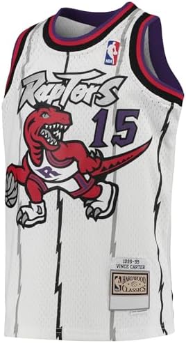 Vince Carter Toronto Raptors NBA White #15 Kids Youth 8-20 Team Color Home Hardwood Classic Player Jersey - Bring back the glory days of Toronto Raptors basketball with this Hardwood Classic Throwback Vince Carter #15 Youth Basketball Jersey. Perfect for young fans who want to celebrate one of the NBA’s most legendary players, this jersey combines retro style with modern comfort—ideal for both on-court action and casual wear. Designed in the iconic Toronto Raptors White team colors, this youth-sized jersey features tackle-twill stitched lettering and numbers for an authentic game-day look that honors Carter’s unforgettable career. The #15 and player name on the back let everyone know who your young baller supports, while the breathable mesh body keeps them cool whether they’re shooting hoops, cheering from the stands, or rocking it as part of their everyday style. With a classic sleeveless cut, rib-knit collar and armholes, and a straight hem for easy movement, this jersey delivers both performance and style. Available in youth sizes Small (8), Medium (10/12), Large (14/16), and X-Large (18/20), it’s the perfect fit for kids ages 8–20 who want to rep their team and their favorite player. Get your young Raptors fan game-ready with this Vince Carter #15 Youth Hardwood Classic Throwback Jersey—a timeless piece that brings Miami basketball history to life while delivering all-day comfort.