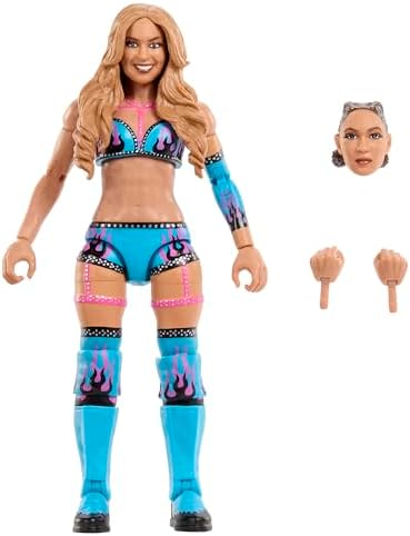 Her fists don’t lie: Lola Vice is ready to strike with her first-ever action figure in Mattel WWE Elite 120! Vice is ready to dance and to KO her opponents with two unique headscans: a smiling scan with long, flowing hair, and a fierce, determined scan with braided hair. Vice unleashes a striking barrage on her opponents in a vibrant sky blue athletic top and trunks featuring a pink-and-black flame design, studded black trim, and pink strap details. She’s also wearing a matching blue arm sleeve and knee pads with flame designs as well as blue kickpad boots, and her accessories include an additional pair of hands for versatile striking poses! Lola Vice - WWE Elite 120 Toy Wrestling Action Figure by Mattel!