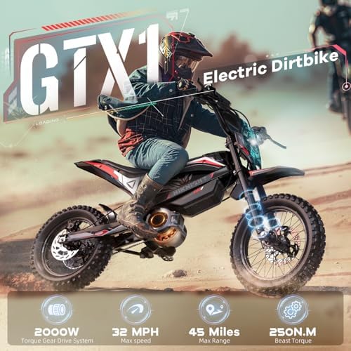 - 🚀【𝟐𝟎𝟎𝟎𝐖 𝐑eduction 𝐇yper 𝐌otor】This Powerful Electric Dirt Bike is equipped with a 𝐑eduction 𝐌id 𝐃rive 𝐇yper 𝐌otor⚡. The integrated gear amplifies the wheel torque to a staggering 250 NM while achieving a top speed of 32 MPH; The 𝐌id-𝐃rive 𝐋ayout ensures a scientifically optimized weight distribution ⚖️, delivering unparalleled handling that makes the GTX1 feel like a true extension of your body. Performance and control—we never compromise! 😤