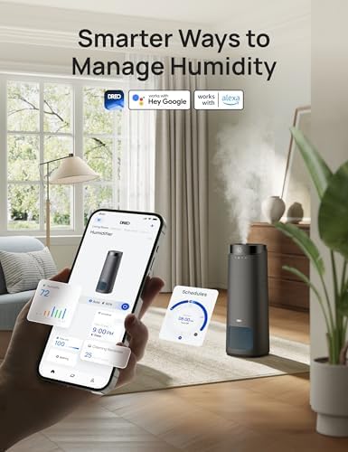 - S𝗺a𝗿𝘁 C𝗼𝗻𝘁𝗿𝗼𝗹 a𝘁 Y𝗼𝘂𝗿 F𝗶𝗻𝗴𝗲𝗿𝘁𝗶𝗽𝘀: The cool mist humidifiers could manage humidity anytime, anywhere via app, voice, or remote. Set precise on/off timers and personalized schedules to match your routine, ensuring ideal comfort and seamless humidification at home or away.