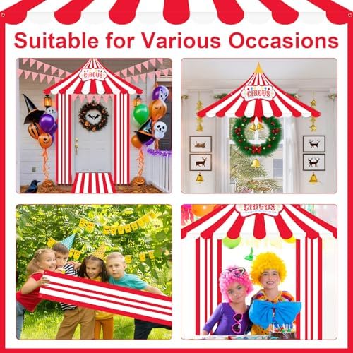 - Large Size: Features a spacious circus tent canopy 70.8 x 26 inches, each triangle flag is 7.4 x 10.8 inches, and wide aisle runner 24 x 118 inches. These ample sizes ensure bold visibility, perfect for grand carnival party entrances, hallways, or halloween carnival decorations