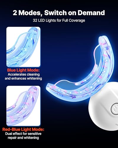 - Powerful Whitening: Our LED teeth whitening kit has 32 red and blue LEDs with two modes. Blue light breaks down stains for fast whitening, and the red-blue combo whitens and soothes sensitivity. Dual wavelengths brighten teeth and reduce discomfort