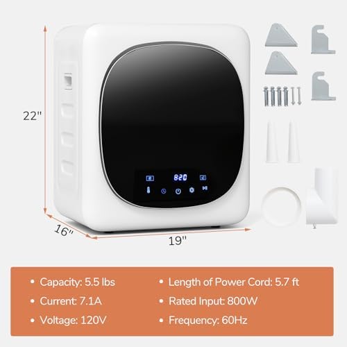 Description:Enjoy efficient and customized clothing drying process with our clothes dryer.Designed with an LED touch panel and intelligent drying programs, this 1.5 cu.ft laundry dryer allows you to choose according to your needs. Its 800W high working efficiency enables it to heat up to 149 °F, while the triple-layer filtration system can filter out particles before. Meanwhile, safety is smartly built-in. An NTC sensor constantly monitors temperature, dual cut-offs respond to any surge or overheat and when the door opens, the drying stops automatically. Plus, there are more thoughtful details including magnetic door catch, convenient handle and cord holder to ensure effortless operation and cord management. This clothes dryer also features easy assembly: freestanding, stacking, under counter or wall-mounted for your convenience.Features:Ensure powerful working ability with 800W high performanceHeat up to 149℉ for reliable drying1.5 cu.ft large drying capacity for great efficiencyDebris can be removed after passing through the triple-layer filtration systemLED touch panel for clear displayingIndicators of disinfecting, cleaning, door opening and deodorizing to show the statusChoose programs intelligently with smart settingTailor your drying process with 5 timer settings and 4 temp settingsNTC temp sensor for temperature auto-controlEnsure safety with overheat and over-current protectionStop automatically when the door is openedThe maximum opening angle of the door is 130° for easy access to clothesFreestanding, stacking, under counter or wall-mounted according to your needsMagnetic door catch and convenient handle for safe and easy opening and closingCord holder for effortless and neat cord storageStainless steel drum for long-lasting service lifeFlexibly adjust the elbow vent duct to direct exhaustOutlet filter for clean drying processKeep stable with adjustable foot padsSpecifications:Color: WhiteMaterial: Metal, ABSProduct Dimensions: 19" x 16" x 22"/48 x 40 x 56 cm (L x W x H)Length of Power Cord: 5.7 ft/1.75 mNet Weight: 36 lbs/16.5 kgCapacity: 5.5 lbs/2.5 kgVoltage: 120VFrequency:60HzPower: 800WCurrent: 7.1AMaximum Temperature: 149℉/69℃Timer Setting: 20 Mins/30 Mins/1H/1.5H/2H/3HTemp Setting: 40℃/50℃/60℃/--℃ (Indicate Natural Air) 104℉/122℉/140℉/--℉ (Indicate Natural Air)1 x Clothes Dryer1 x Exhaust Vent1 x Instruction